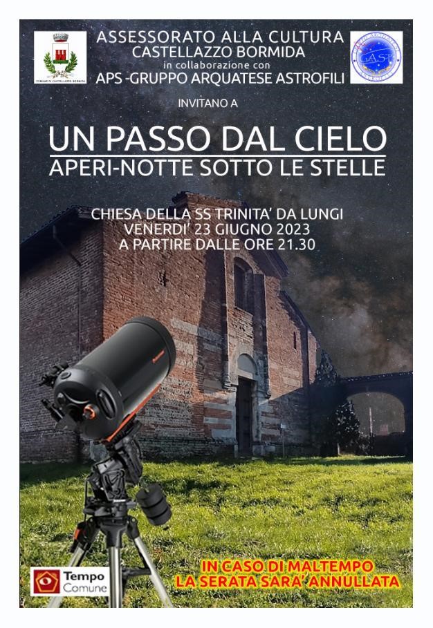 Il Comune di Castellazzo Bormida, in collaborazione con l’APS GAST – Gruppo Arquatese Astrofili, il 23 giugno 2023 organizza la serata tema astronomico “Un passo dal cielo – aperi-notte sotto le stelle” nella radura di fronte alla chiesa della S.S. Trinità da Lungi. L’evento, sotto la guida di personale esperto, permetterà al pubblico presente di conoscere più a fondo le meraviglie del cielo e di conoscere le leggende che identificano le costellazioni.